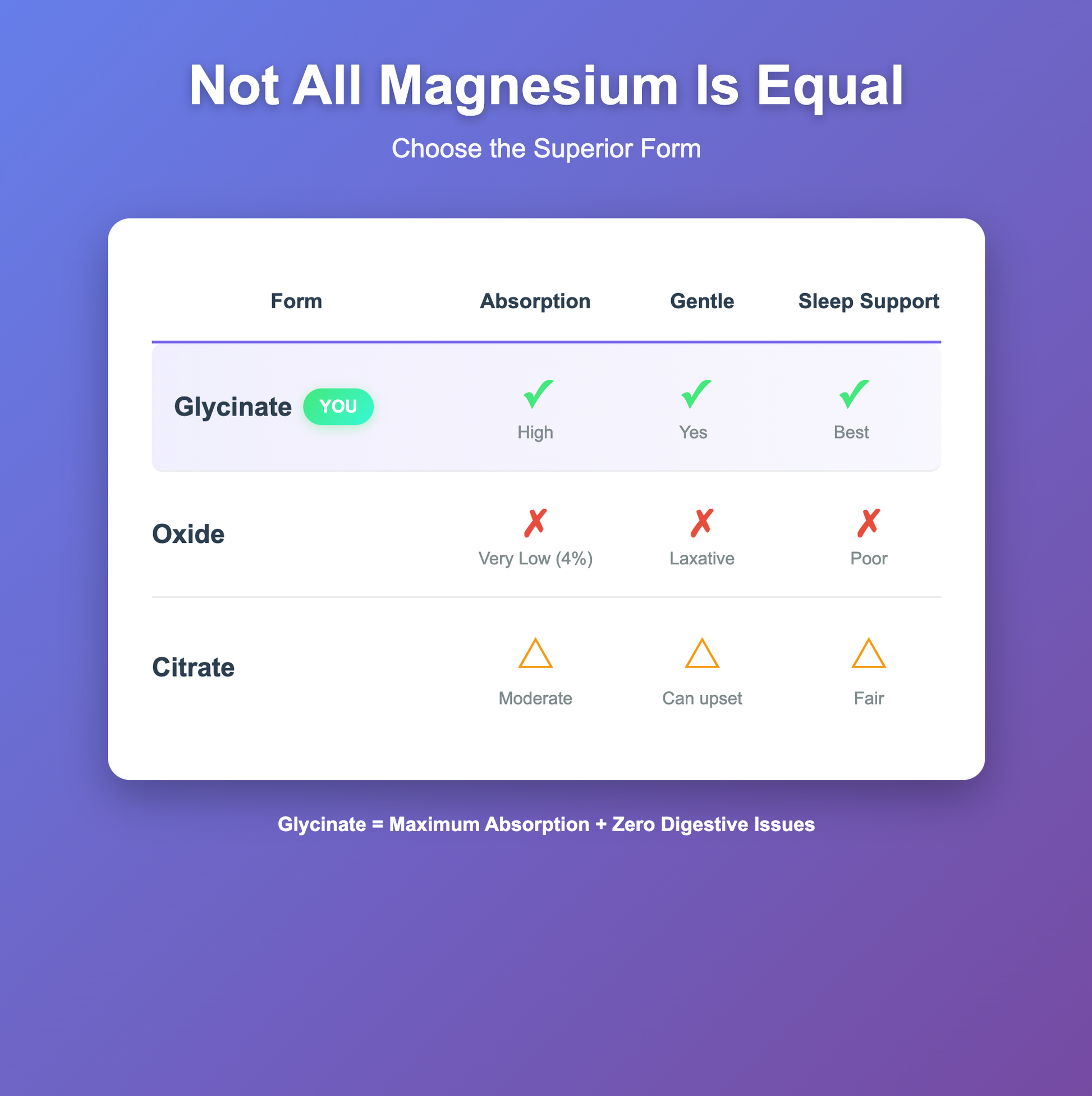 People often purchase magnesium glycinate supplements to help them relax and fall asleep more readily. And because this is a chelated form of magnesium, it’s more bioavailable than other forms.